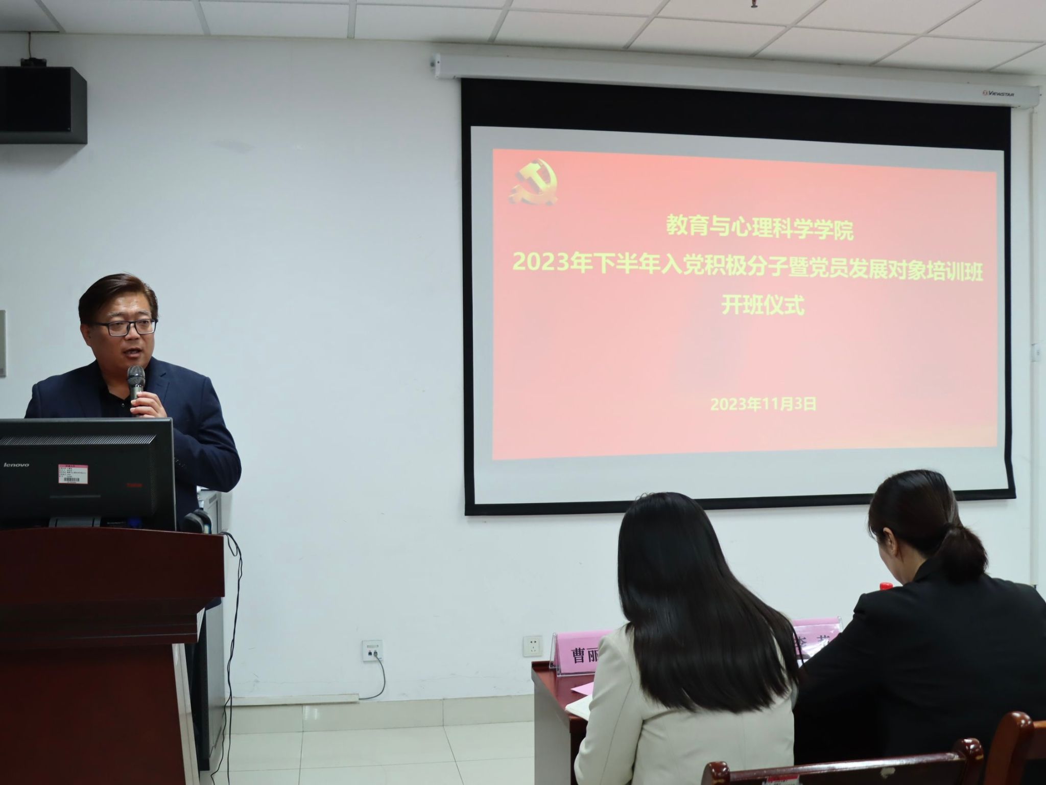 党委举行2023年下半年入党积极分子、党员发展对象培训班开班仪式。学院党委书记季竹君,党委副书记、副院长李莉,学生支部书记卓华丽、刘晓彤老师出席,2023级辅导员曹丽丽主持本次仪式。