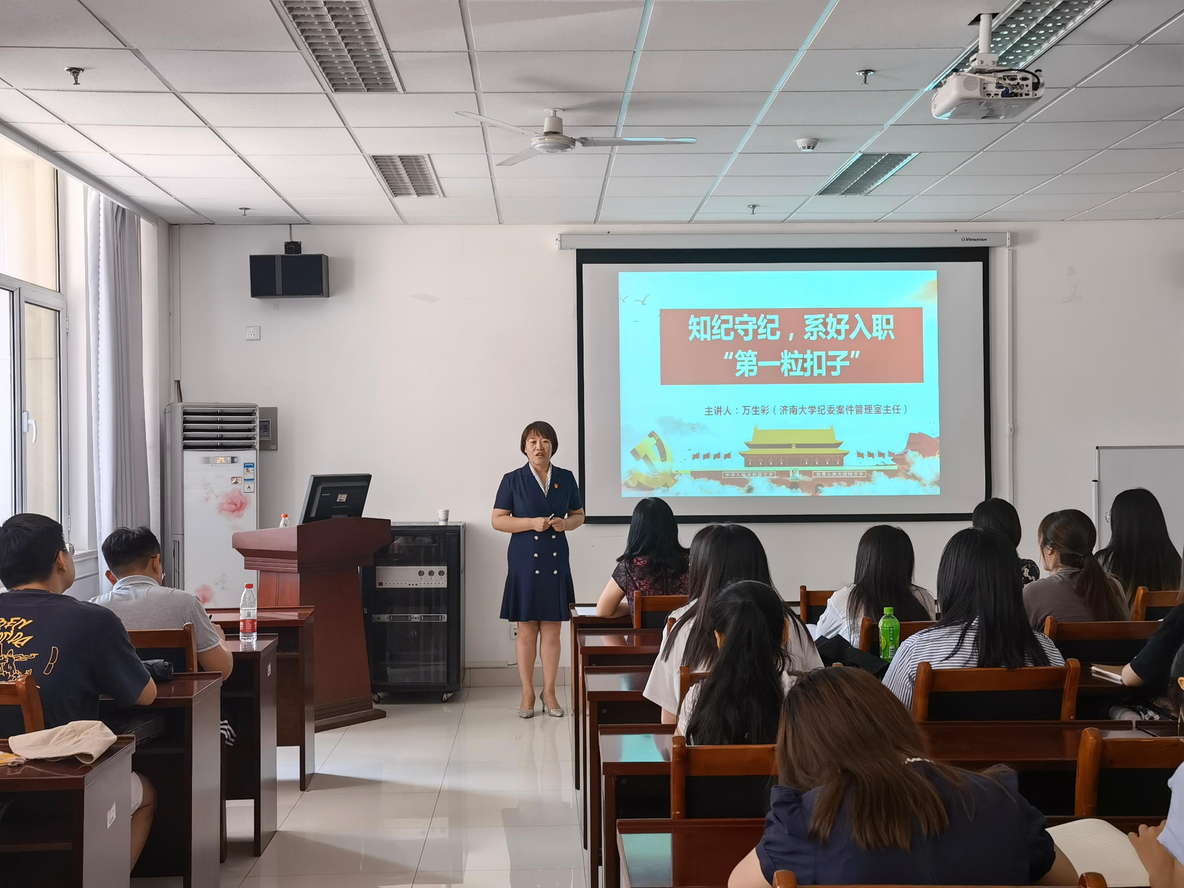 万生彩以“知纪守纪,系好入职第一粒扣子”为题,紧扣毕业生党员实际,围绕什么是党的纪律、党的百年纪律建设的历史脉络、党的百年纪律建设的基本经验、身边的违纪违法案例、严于律己等五个方面进行详细讲解,通过一桩桩、一件件典型案例,为毕业生党员上了一堂内容全面、条例清晰、例证丰富、数据详实的廉政教育课。