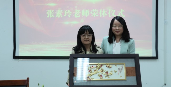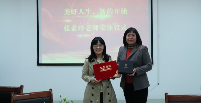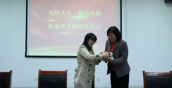 陈功香院长代表学校为张素玲教授颁发了光荣退休证书、荣休纪念品