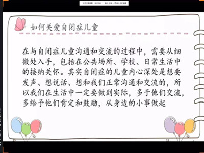 本次自闭症知识的线上宣讲会中,四名志愿者分别以如何关爱自闭症、自闭症儿童的病因、主要临床表现与特点以及志愿者们与自闭症儿童相处的故事为主要内容进行讲解,为更多人普及自闭症的相关知识,号召更多大学生志愿者和社会群体关注自闭症,关爱自闭症患者。让我们一起携手,为给自闭症患者创造包容的社会环境共同奋斗!从一个善意的眼神做起,让世间美好与他们环环相扣。