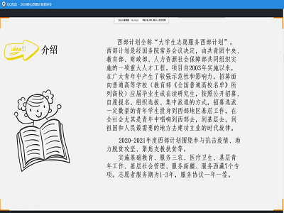 为了积极响应国家号召,向同学们普及有关“西部计划”的相关知识,鼓励同学们毕业后积极投身西部建设,4月14日,在学院团委书记魏文静的指导下,学院心泉青年志愿者协会组织了线上宣讲活动。