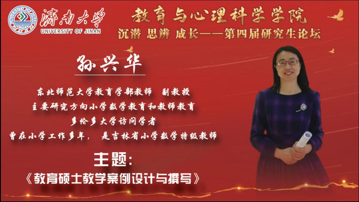 第四届研究生论坛第五期于2021年12月2日在线上成功举办,邀请东北师范大学教育学部教师、副教授,多伦多大学访问学者,吉林省小学数学特级教师孙兴华老师开展了题为《教育硕士教学案例设计与撰写》的主题讲座,由张素玲教授主持,学院20级和21级研究生以及部分教师参加了此次论坛。